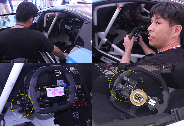 儘管在比賽周末需要忙著與技師溝通,但在訪談過程中,青木拓磨接待來自臺灣的我們時,仍十分熱情與親切地向我們介紹所駕駛的Lamborghini Gallardo LP-560 GT3廠車,以及賽車為了他所進行的特殊改裝。想必許多人好奇,下半身癱瘓的他如何要與一般車手同廠競技,其實很簡單,工程師們為他在油門與煞車踏板上加裝連桿,連桿向上延伸至方向盤左方的操縱撥桿,這跟操縱桿向下前壓時就是煞車,逆時針撥動就是油門,至於轉向與升降檔就得只能用一隻手來完成,且升降檔撥片集合在右側,雖然辛苦了些,但如此一來,青木拓磨也能夠和一般車手同場競技。