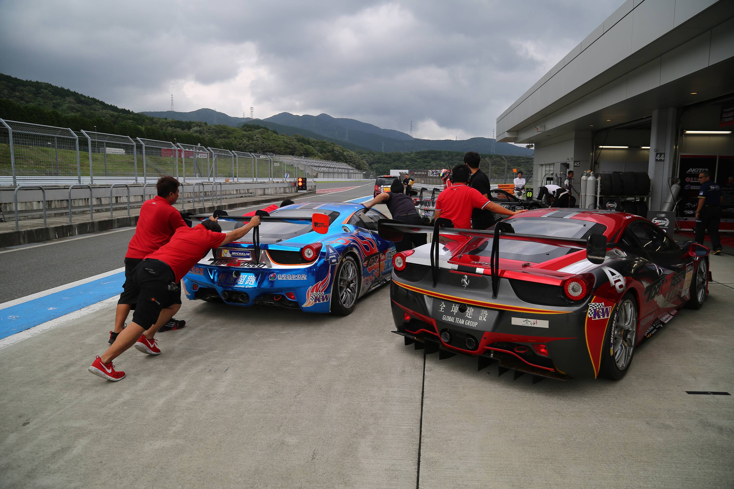 車手們還沒到的前三天我們就展開了一系列的工作,首要當然是車輛的整備與設定,將一輛輛的Ferrari 458 challenge賽車從貨櫃卸下,進行全車性的檢整與保養,任何細節都不能放過,畢竟在賽車場上的激烈競爭,賽車的機械零件運作品質稍有差人強意,車況未能達到最佳巔峰,車手也難發揮做出良好的成績了!