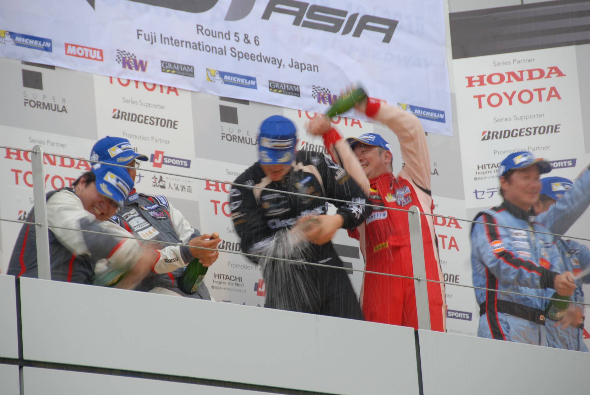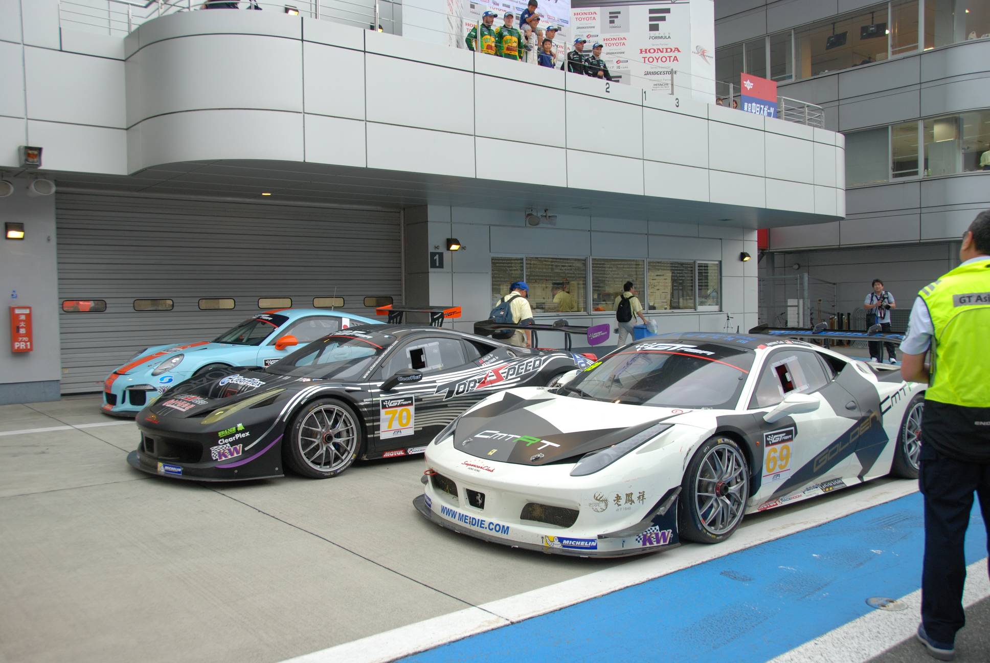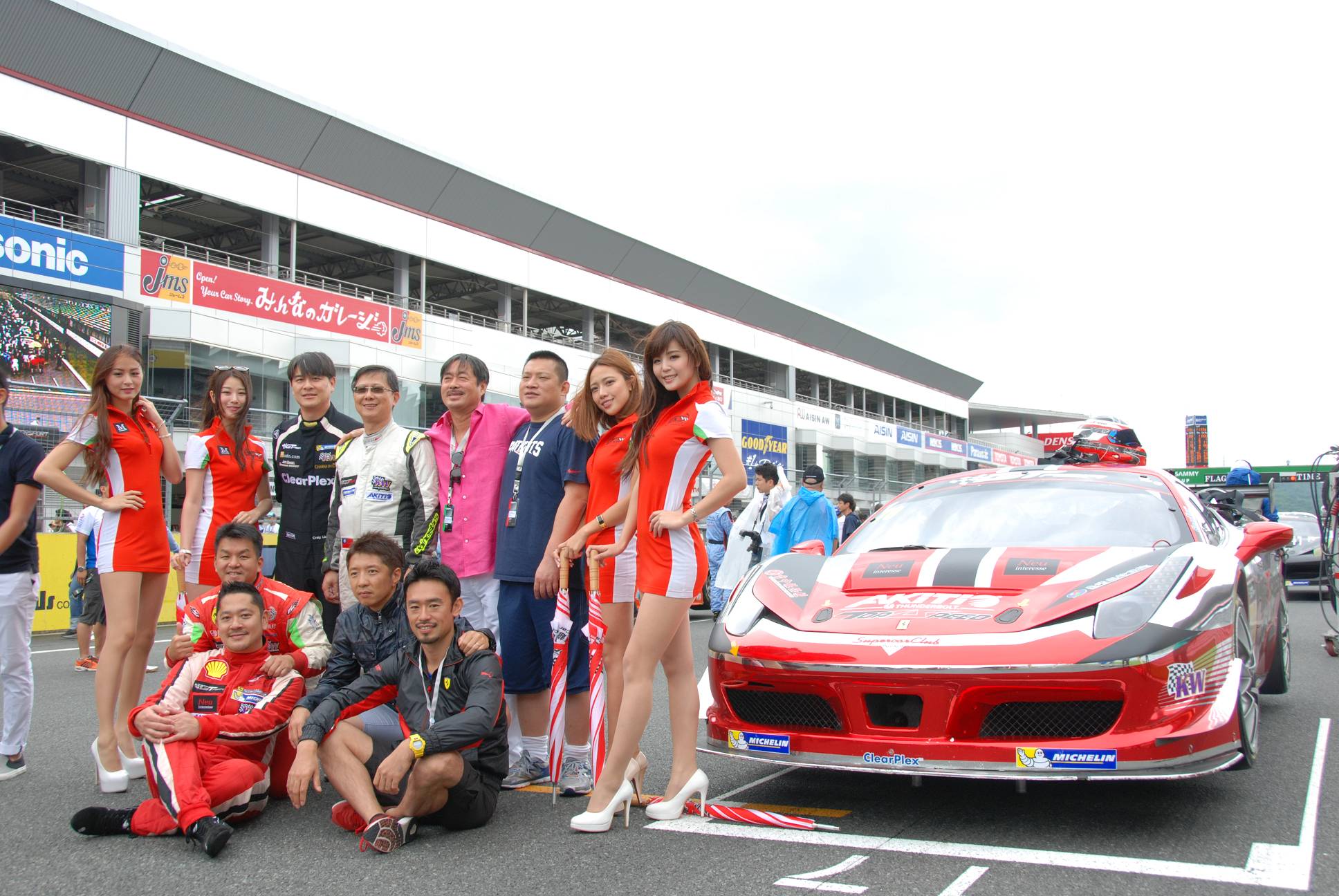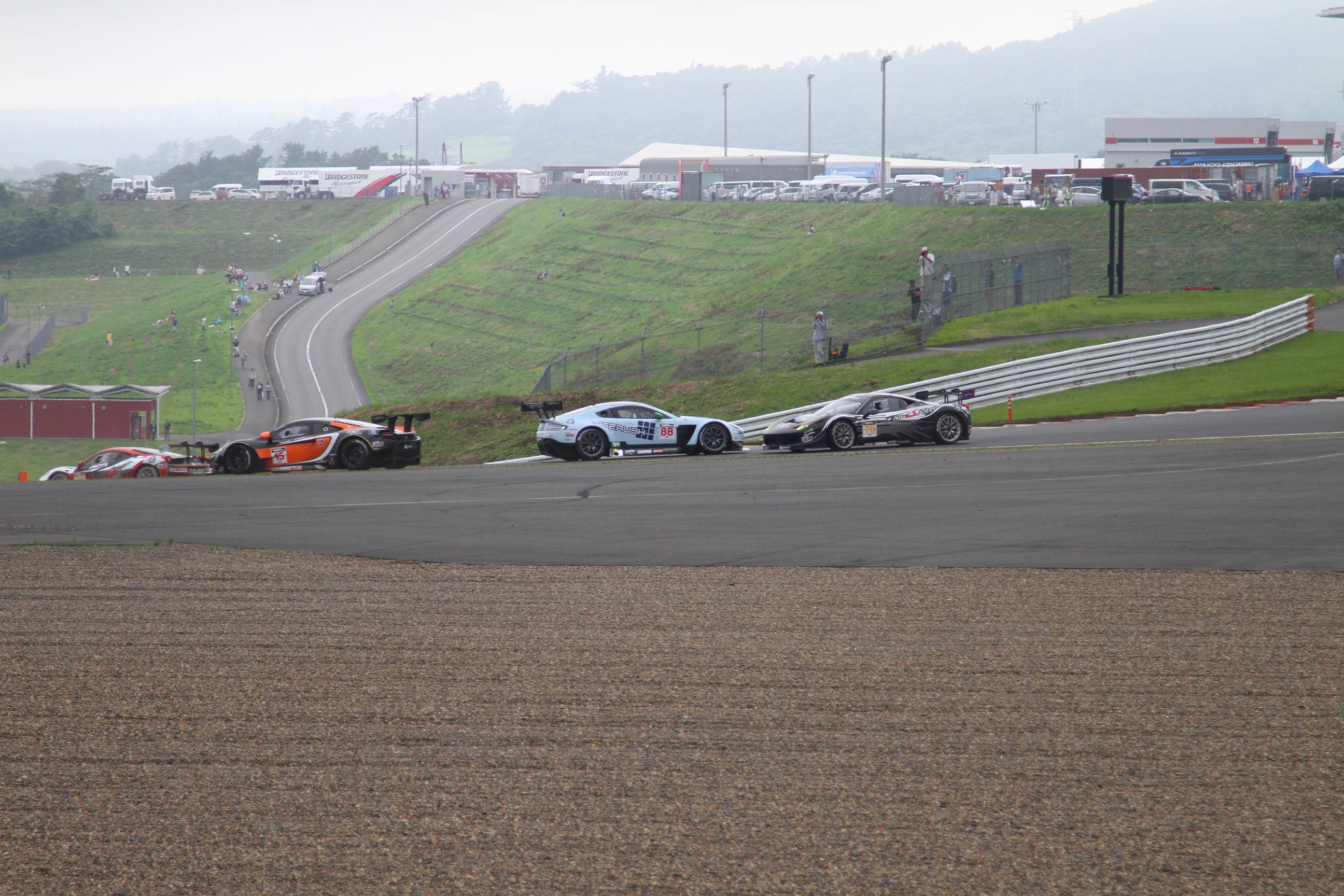 颱風警報!我們在場地布置上遇到了一些困難,原本安穩的帳篷在這裡好似熱氣球要起飛一樣,找了許多重物盡可能壓制住帳篷與物品。緊接著星期四開始練習,車輛在賽道上也頻頻發生難以預測的狀況,高低起伏的富士賽道成了一條條的小河流,雖然不至於積水,但是水流太大也窒礙難行,即使換上了雨胎,要破除賽道上過厚的含水層也有些不穩定,使得各車隊的賽車都處於一種極度不穩定的狀態,只是在練習時段就已經發生多起意外,平均單圈秒數也拉長超過15秒,造成了全新的競爭局面,難以從練習成績推測正賽排位,颱風大風吹、獎落誰家大洗牌!